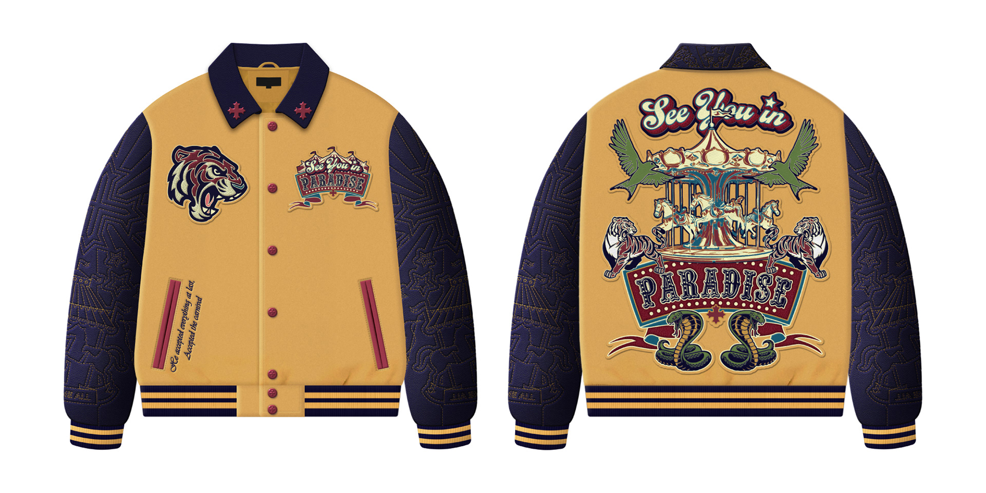 Mockup created with photo textures in Photoshop to create a realistic jacket. Illustration generated in Midjourney and applied to jacket in Photoshop.