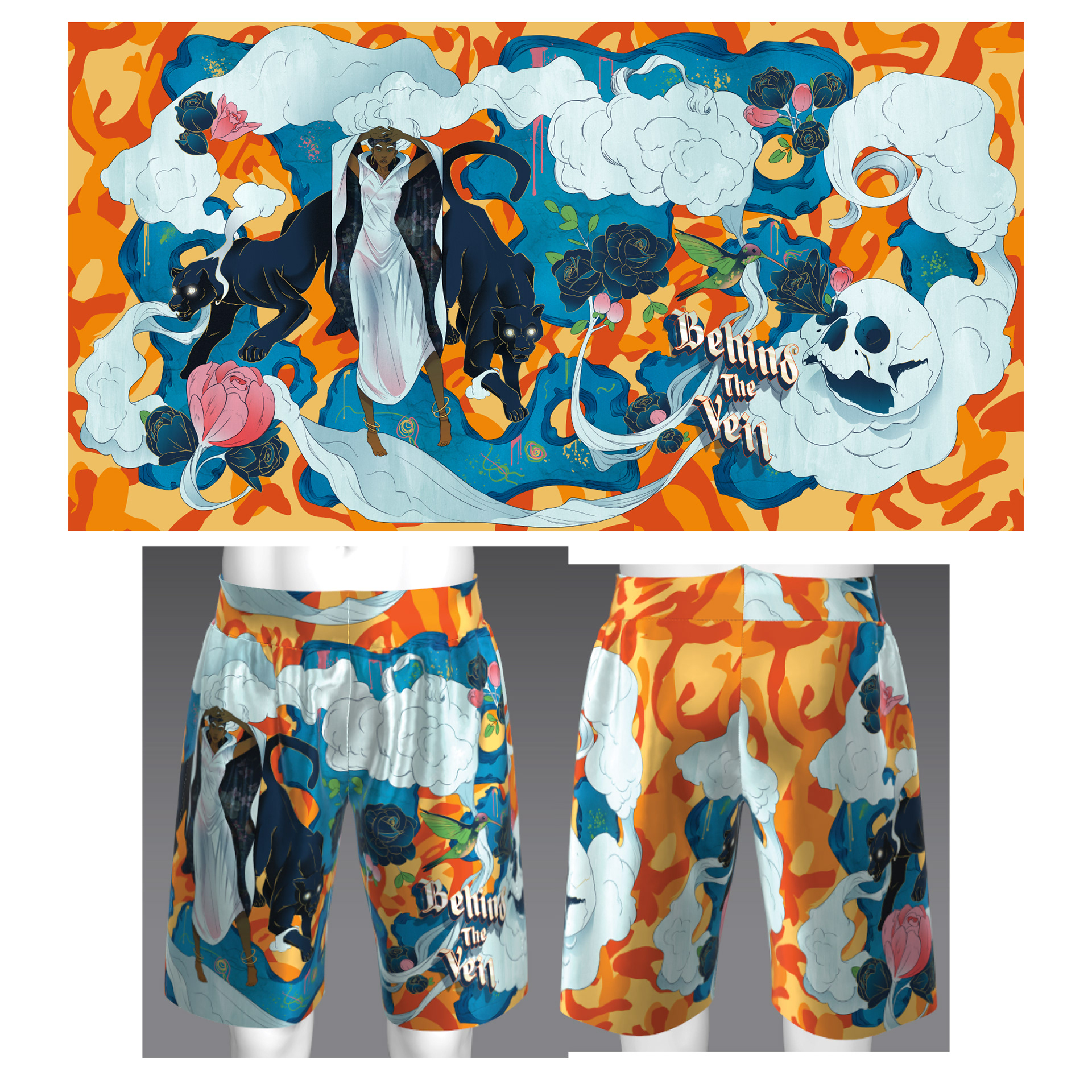Digitally illustrated by hand; inspired by artist James Jean. Shorts were created in Marvelous Designer and illustration was applied to determine print placement.